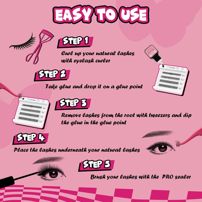 - How to use:Apply the mascara wand cluster lash glue to your natural lashes and wait about 30 seconds.Gently take lashes off the strip by grab them at the root. And clip the lashes as you like with scissors.Then apply the cluster lashes underneath your natural eyelashes, away 2-3mm from your eyelid! Finally, star your new day with your new eyelash!
