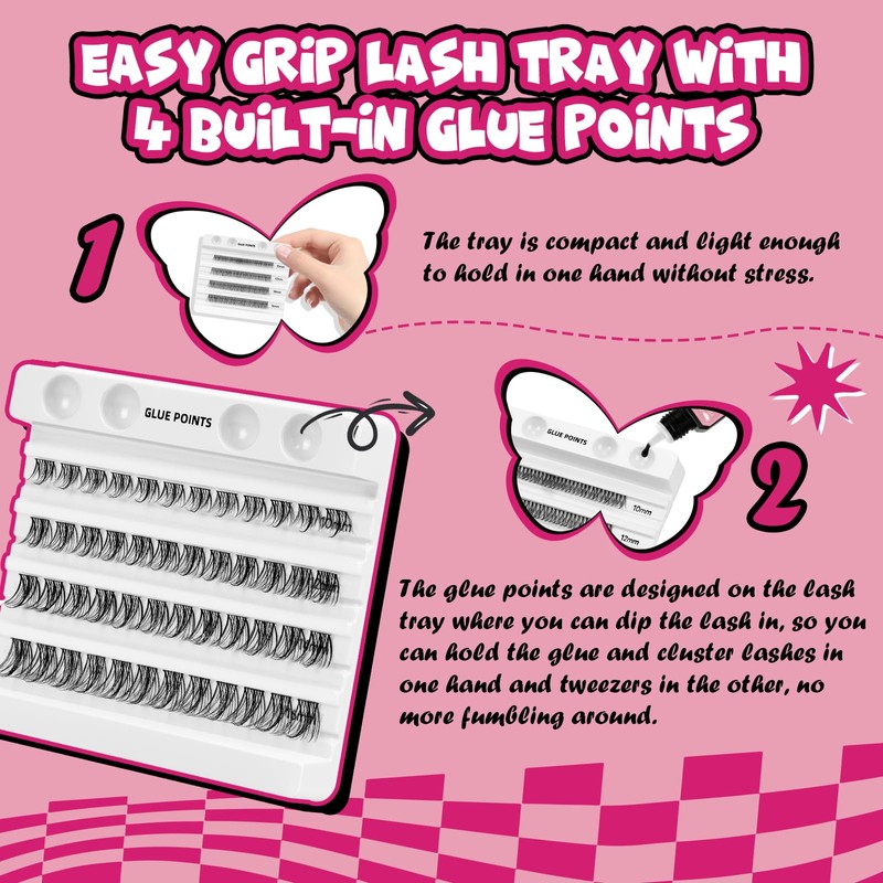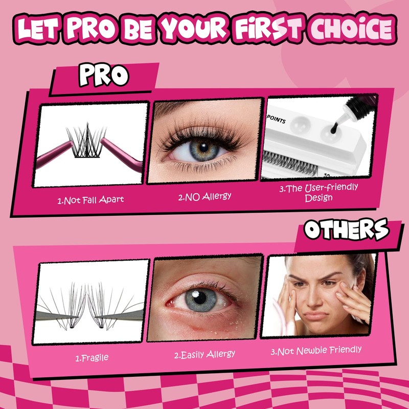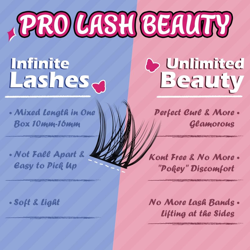 - Bring salon to your home: Pro LashBeauty Lash clusters are easy to apply. Divided individual Lashes into sections, easy to pick up and apply by yourself. You can apply the eyelashes with different lengths and styles according to different occasion. Save money from doing eyelash extensions. You will become a master of DIY lash extensions with a little practice!