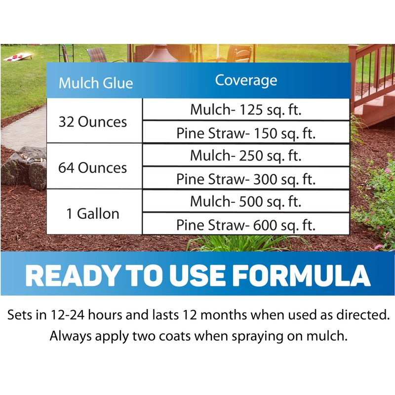 This product is an invisible bonding agent that will keep your mulch securely in place while still allowing water to drain. Tired of losing mulch due to rain? Are your animals making a mess of your mulch? Does your mulch get scattered in the wind? Use Pro Mulch Glue to keep your mulch, shells, sand, pine straw, or stones looking great while saving you valuable time and money. Only apply to dry terrain. SHAKE PRODUCT WELL. Pour product into sprayer. Apply product generously ensuring an even application. When applying to mulch always apply 2 coats. Allow product to dry between coats waiting at least 1 hour between applications. This product is long lasting, fast-acting, and durable. When used as directed, Pro Mulch Glue will fully set in 4-6 hours after application and will last up to 12 months before reapplication is needed. This product will NOT work on rubber mulch.
