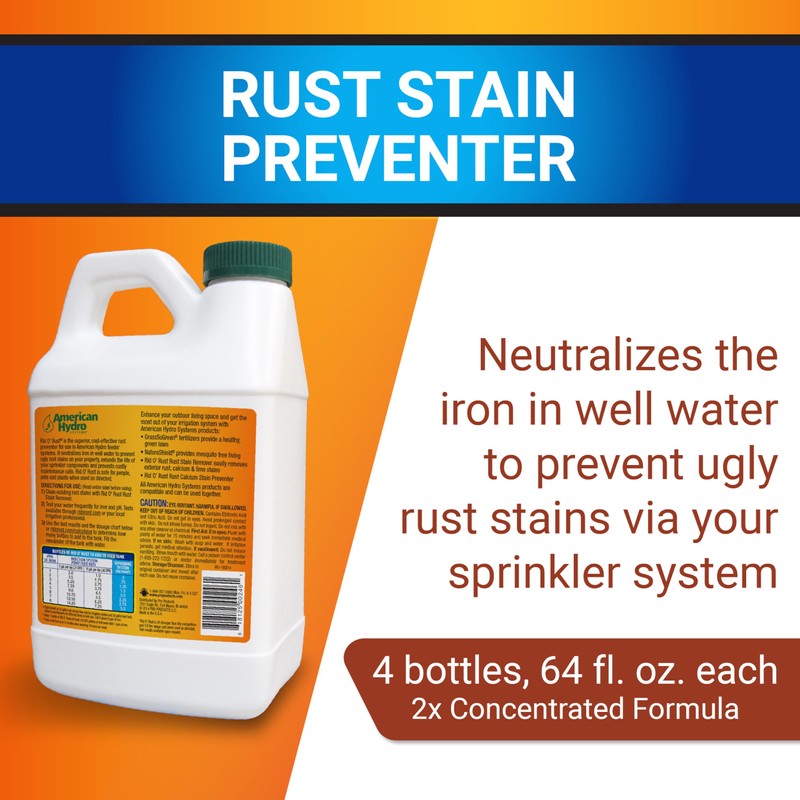 American Hydro Systems RR1 Rid O' Rust inhibitor spray is designed to neutralize iron and minerals in well water to prevent the formation of sprinkler system stains. Protect outdoor surfaces, including driveways, siding, stucco, and sidewalks from rust stains by adding professional-grade Rid O' Rust stain prevention to your sprinkler system feeder tank regularly. The new RR1 2X formula is twice as strong and a cost-effective rust preventer made for American Hydro feeder systems. A half-gallon of this strong cleaning agent will treat 130,000 gallons of water with 1 ppm iron. This multipurpose cleaner can be applied through any irrigation system using the American Hydro feeder system and works with both old and new systems. Keep your sprinkler system rust-free and your exterior hard surfaces stain-free with this new powerful performance formula. The water treatment specialists at Pro Products offer a wide range of solutions that focus on rectifying problems, testing, cleaning stains, and maintaining the performance of water quality equipment.t.