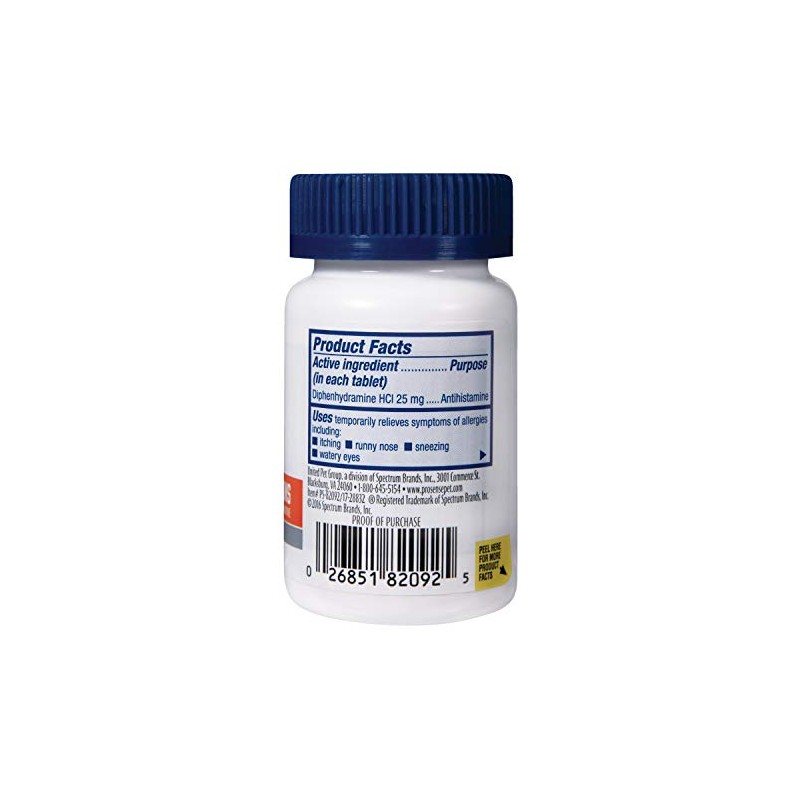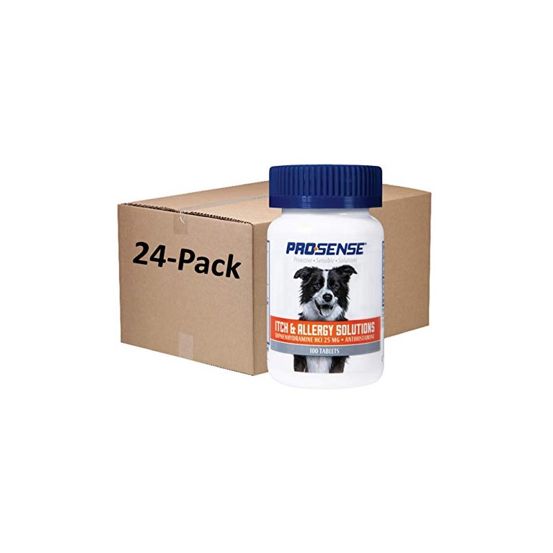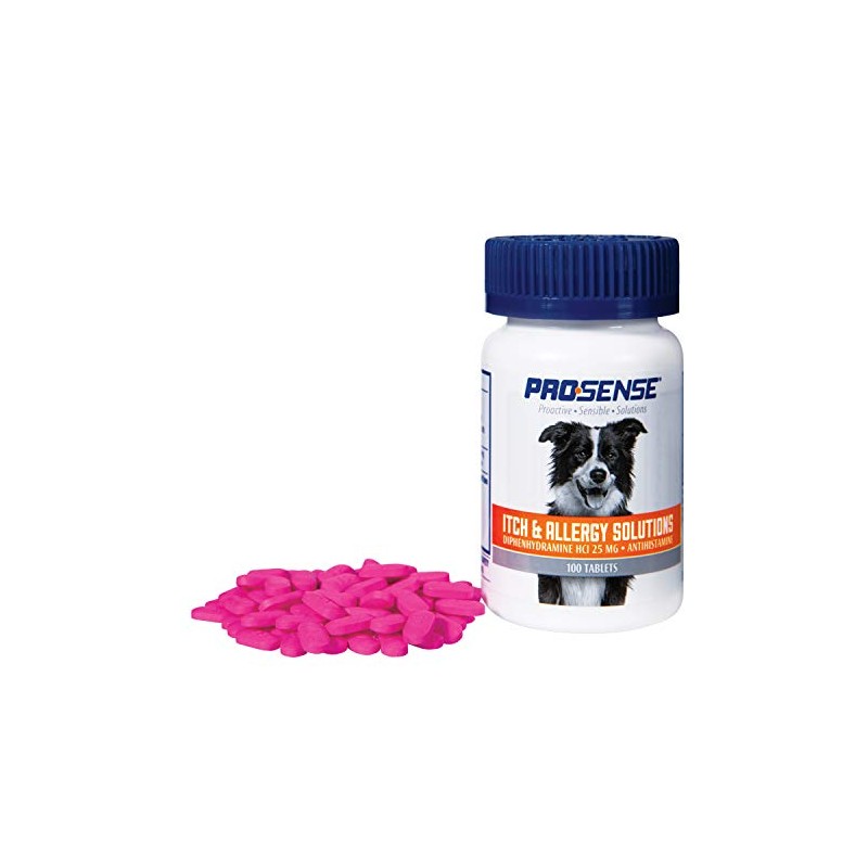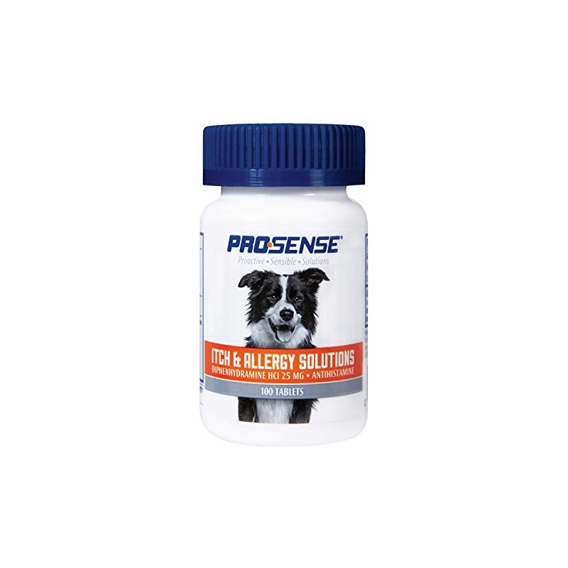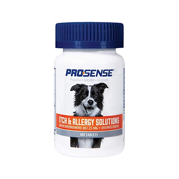 Pro-Sense pet health and grooming solutions are developed with consumers and pets in mind. Our pet health experts specially select formulations to ensure dogs and cats get the dental, joint, nutritional and topical solutions they need for optimum health at sensible prices consumers are looking for.Pro-Sense Itch & Allergy Solutions for dogs offers temporary relief of canine allergy symptoms, including itching, runny nose, sneezing and watery eyes. Each chewable tablet contains 25 mg of diphenhydramine HCI, an antihistamine C for use only with dogs. For a pet weighing 15 pounds or more, give ? tablet for each 15 pounds of body weight. Administer twice per day. For a pet weighing less than 15 pounds, ask a veterinarian. Use only as directed C read the complete product label before use. Contains 100 chewable tablets.Common household allergens include pollen, dust and house mites, dander, feathers, fleas, perfumes and cleaning products. In addition to administering an antihistamine when needed, you can vacuum frequently and bathe your dog weekly with a medicated shampoo to help relieve your pet's allergy symptoms. Talk to your veterinarian about persistent allergy problems.