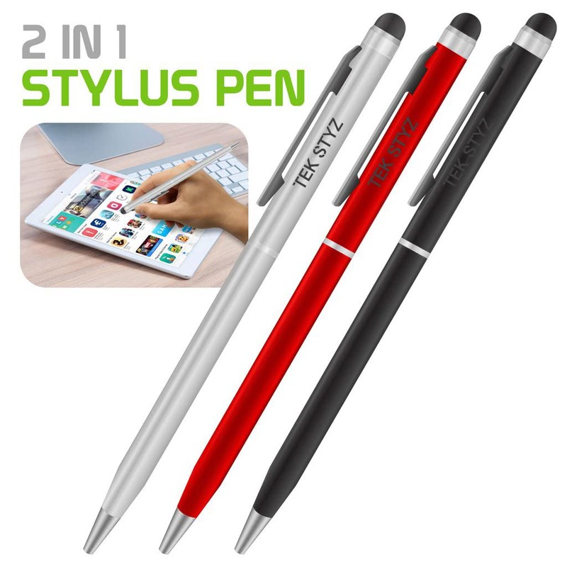 • INCLUDED: Full Size Stylus Kit of three pens with ink, clip, in retail packaging. COLORS: (1)Red, (1)Black, (1)Silver