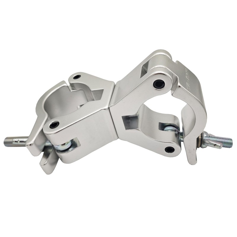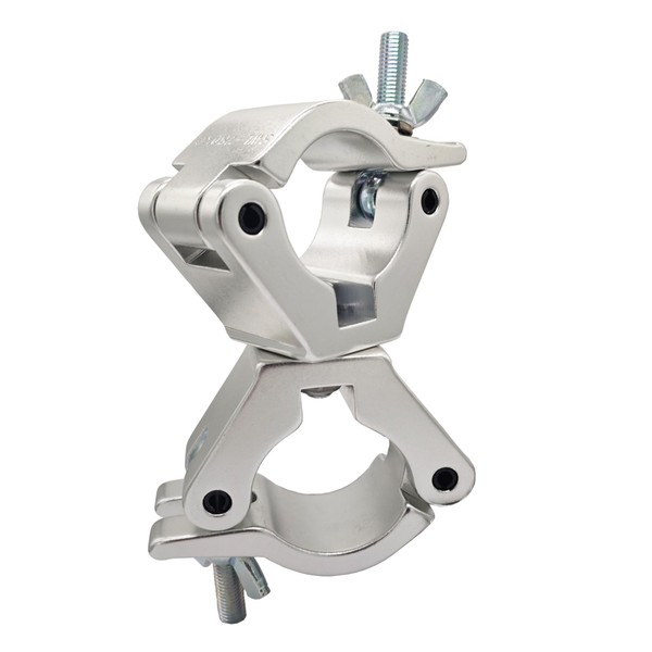 - Heavy-duty Dual Swivel Truss Clamp, designed for professional lighting equipment, supports 56-61mm pipe diameters, equipped with quick-release O-clamps and dual-head tube mounting brackets, featuring a wrap-around design to ensure secure installation, suitable for various applications such as DJ lighting, trusses, and light poles.