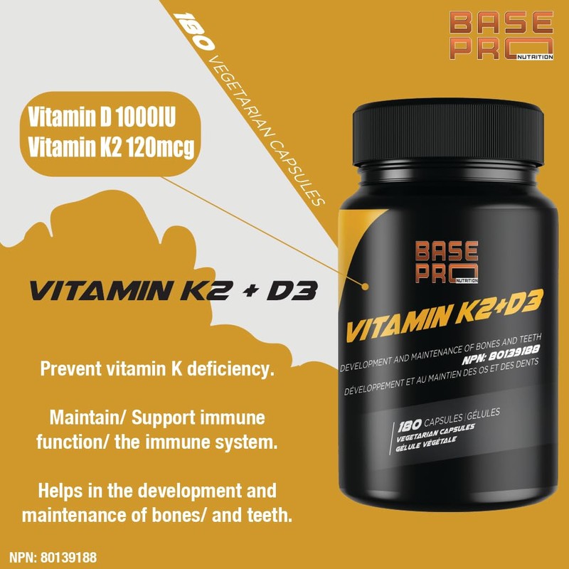 PRO Vitamin K2+D3-180 CAPSULES | Vitamin K2 120mcg per Serving | Vitamin D3 1000IU per Serving | Base Pro Nutrition | 180 Vegetarian Capsules | K2+D3 |