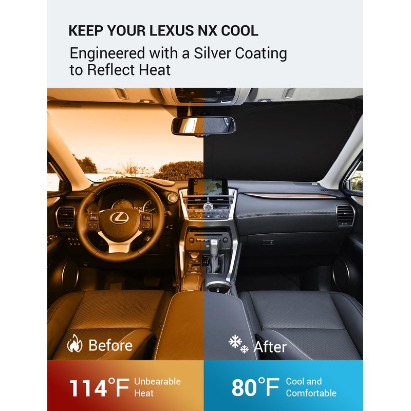 - Keep Car Cool: Engineered with a silver coating to reflect heat, reducing heat buildup by up to 40°F and blocking 99% of harmful UV rays. Keep your Lexus NX cooler and prevents leather seats from cracking and fading