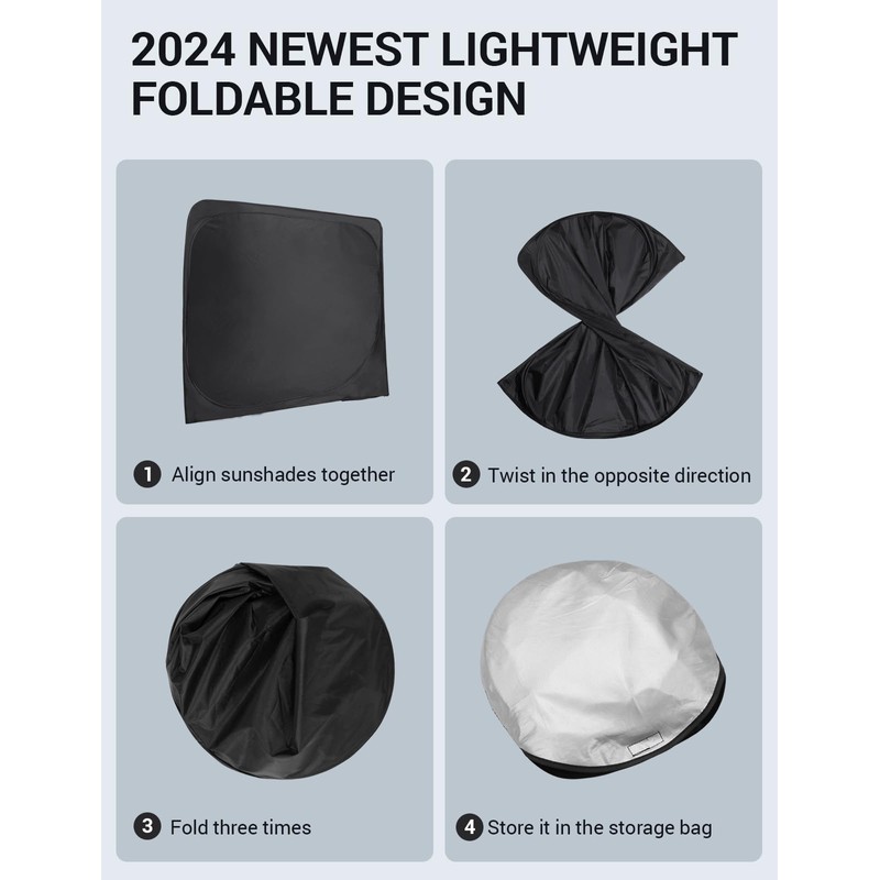 - Easy to Use and Store: Unlike other products on the market, We use a Lightweight collapsible car window sun shade design. The windscreen sunshade can be easily popped up and folded in seconds for daily use. You can easily tuck the car sun visor protector into your door pocket