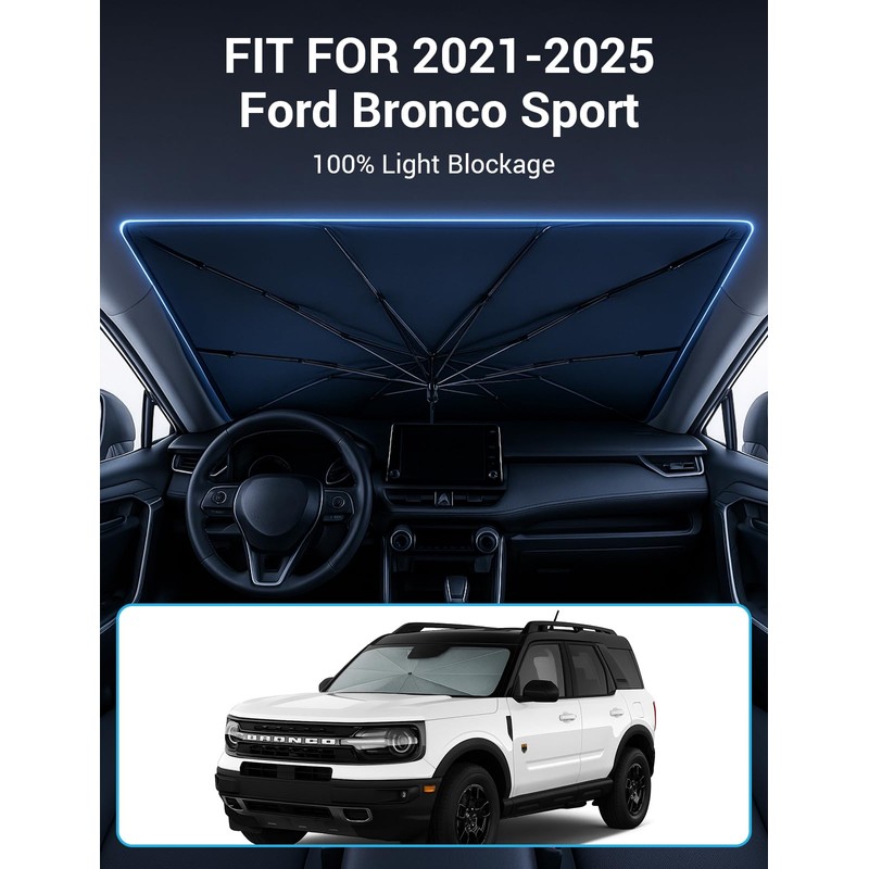 - Customized Windshield Sunshade: Specially designed for the 2021-2025 Ford Bronco Sport with precise mirror cutouts, providing 100% shading, sturdy handle, ensuring lightweight and durability while also having a fashionable feel. Our Bronco Sport windshield sunshade can protect the interior of your car from various light damage and prevent dashboard and seat degradation.