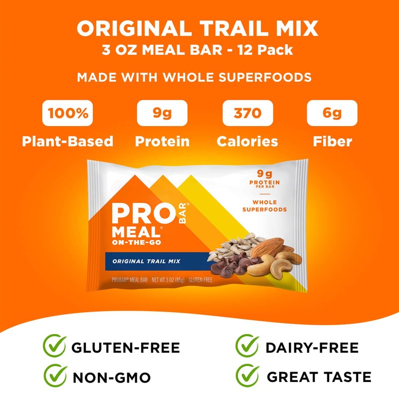 The Original Trail Mix tastes like your favorite trail mix in a meal replacement nutrition bar. It is a delectable combination of whole grain goodness, chunky nuts, and moist, delicious fruits. PROBAR maintains a strong commitment to quality, sustainability, and fantastic taste by creating delicious, convenient, healthy, plant-based food products from Non-GMO sources.