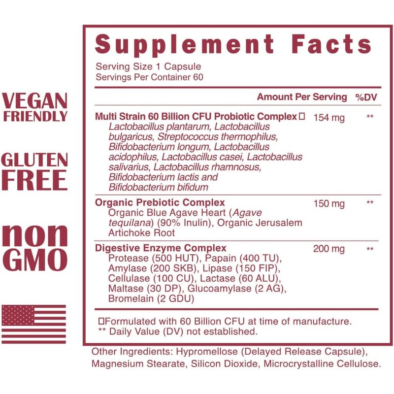 Probiotic and Prebiotic Supplement 60 Billion CFU with Digestive Enzymes, Acid Protection, Delayed Release, 60 Capsules, 60-Day Supply