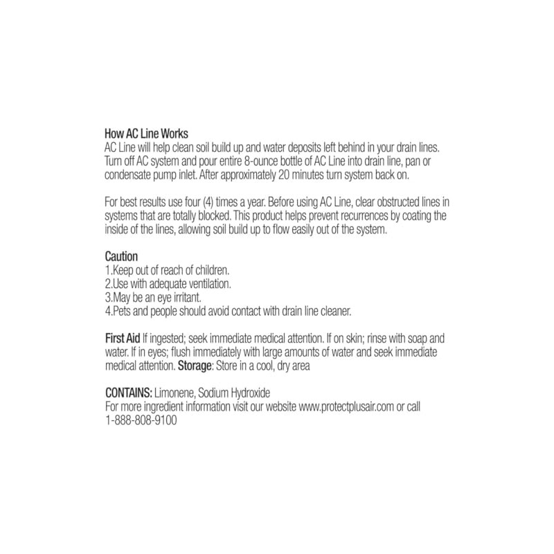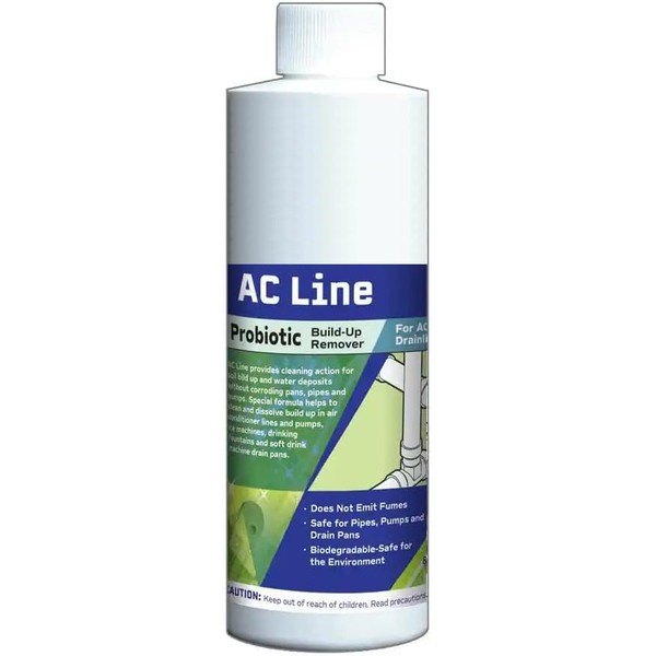 The AC Line Probiotic Build-up Remover helps clean buildup of soil and water deposits in your HVAC system. Safely cleans the drain lines, drain pans, pipes and pumps. Keeps AC drain pans and lines flowing freely. Use throughout the year for regular DIY maintenance. Safe for use in HVAC drain lines, drain pans, pipes and pumps Does not emit fumes Works in about 20 minutes 8 fl. oz. bottle, no diluting or mixing required