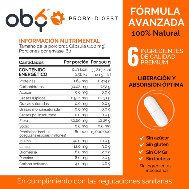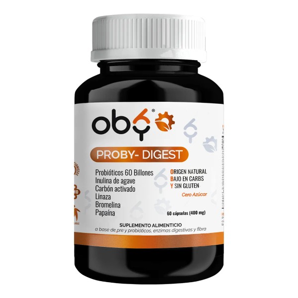 - DIGEST Combinación creada con expertos nutricionistas y científicos: 60 Billones de Probióticos y Prebioticos, Inulina de Agave, Enzimas digestivas (Bromelina y Papaina), Fibra natural de Linaza y Carbón activado vegetal de cáscara de coco. Sugar FREE, gluten FREE. PROBIOTICOS AVANZADOS. Cada capsula contiene 60 billones de probióticos UFC (Unidades Formadoras de Colonias) que forman esporas, resistentes a ácidos gástricos y bilis para llegar vivos e intactos al intestino. Tecnología de Óptima Liberación para máxima absorción después de aproximadamente una hora de su ingesta, enriqueciendo y equilibrando la flora intestinal. Probioticos para mujeres y hombres, ayuda a tu flora intestinal gracias a sus 60 billones de probióticos y al prebiótico de inulina de agave + linaza, fibras especiales para el estreñimiento. PROBIOTICOS Y ENZIMAS DIGESTIVAS. Reforzado con enzimas digestivas de bromelina y papaína, especializadas para mejorar la digestión general y de alimentos pesados. Nuestra fórmula especializada además de sus probioticos 60 billones, está enriquecida con carbón activado vegetal, que ayuda a liberar toxinas y esos molestos gases. OBY Probioticos PROBY DIGEST, es un suplemento alimenticio diseñado pensando en el refuerzo del sistema inmune digestivo. Son microorganismos benéficos que junto con los prebióticos trabajan para equilibrar la flora intestinal, recubrir y proteger el estómago de acidos gástricos. Contiene de las cepas más estudiadas y reconocidas: Bacillus coagulans en esporas. METODO DE USO SUGERIDO