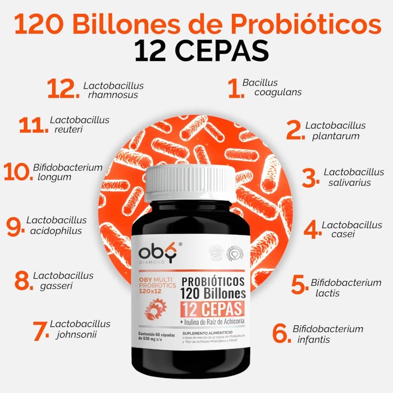 - OBY Multiprobióticos Diamond Line – Máxima Potencia y Efectividad 120 billones de probióticos de 12 cepas avanzadas por porción, enriquecidos con prebióticos de inulina de raíz de achicoria para una acción sinérgica que potencia su efectividad. Beneficios clave: