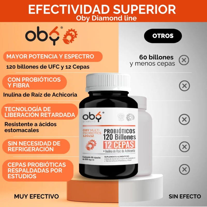Descubre el poder transformador de Probioticos Avanzados 120 Billones De 12 Cepas + Prebioticos, la joya de la línea OBY Multiprobióticos Diamond Line. Con una fórmula de máxima potencia, cada cápsula está diseñada para ofrecerte un soporte integral que revitaliza y equilibra tu salud intestinal. 🌿
