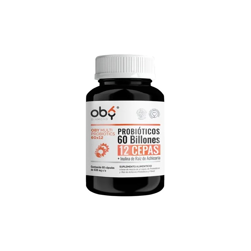 Probioticos Capsulas. 60 Billones de Probioticos de 12 DIFERENTES TIPOS DE CEPAS ESPECIALIZADAS, además enriquecidos con PREBIOTICOS de Inulina de Raiz de Achicoria. Frasco con 60 capsulas para hasta 2 meses. La fórmula más avanzada de la nueva línea de OBY Probioticos: línea Diamond. ¡Cada capsula contiene: 60 Billones de Probioticos Avanzados de 12 DIFERENTES TIPOS de CEPAS, Enriquecidos con Prebioticos de Inulina de Raiz de Achicoria. Probioticos de CALIDAD PREMIUM. No requieren refrigeracion. Sin azucar, sin gluten, Sin Lactosa, Sin carbohidratos, sin OMGs. 12 CEPAS AVANZADAS: Bifidobacterium Lactis, Bifidobacterium Longum, Bacillus Coagulans, Lactobacillus Rhamnosus, Lactobacillus Casei, Lactobacillus Gasseri, Lactobacillus Plantarum, Lactobacillus Reuteri, Lactobacillus Salivarius, Lactobacillus Acidophilus, Bifidobacterium infantis, Lactobacillus Johnsoni. OBY suplementos alimenticios, combinaciones de ingredientes creadas por expertos en nutrición y científicos.
