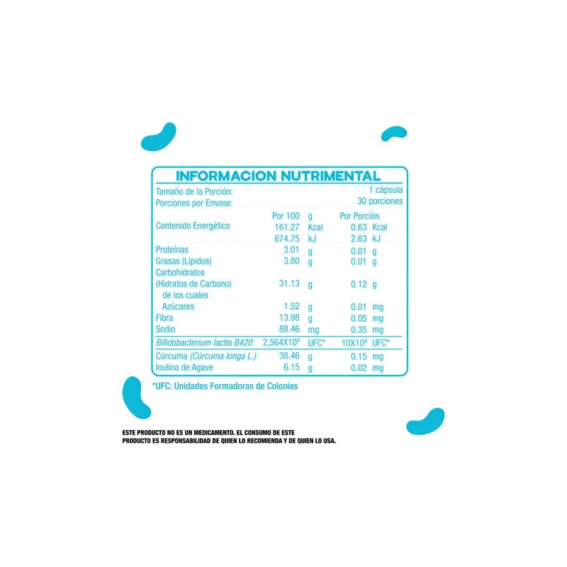 Suplemento Alimenticio con probiótico Bifidobacterium lactis B420) + Cúrcuma + Prebióticos.