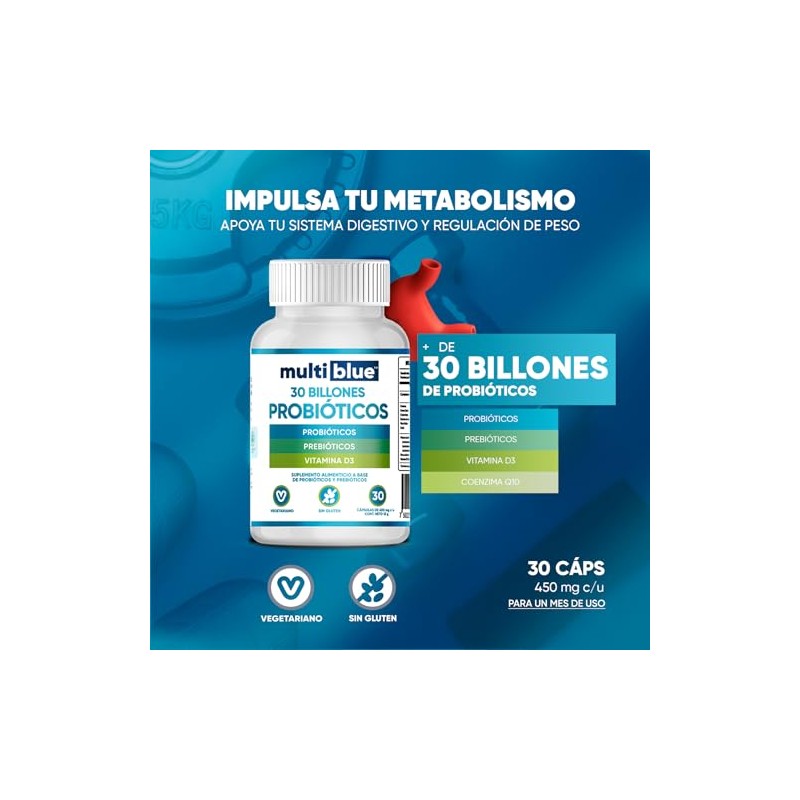 Probióticos y Prebióticos 30 Cápsulas | 30 Billones UFC | Lactobacillus, Acidophilus, Paracasei y Vitamina D3 | 100% Natural, Sin Gluten | 1 capsula diaria (1 mes) | Suplementos Alimenticios MULTIBLUE