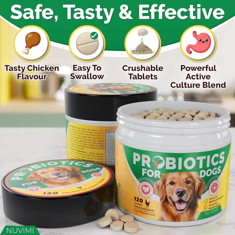 Probiotics for Dogs, 120 Chicken Flavor Dog Probiotic & Prebiotic Tablets, Immune Boost & Digestive Support for Upset Tummy, Loose Stools & Bloating, 1-4 Month Supply