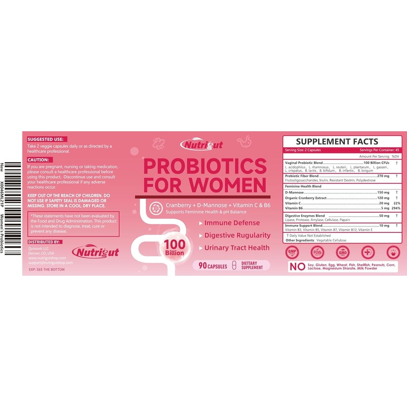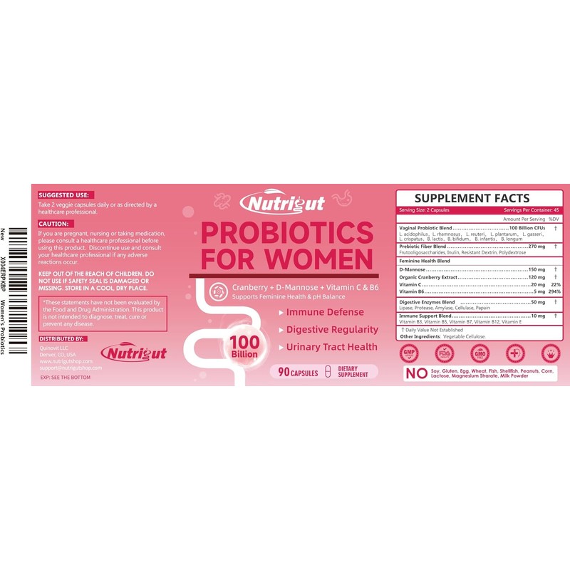 Probiotics for Women 100 Billion CFUs Probiotic and Prebiotics with Digestive Enzymes for Gut Health, Vaginal Probiotics with Cranberry and D-Mannose for Urinary Tract Health, pH Balance, 90 Capsules