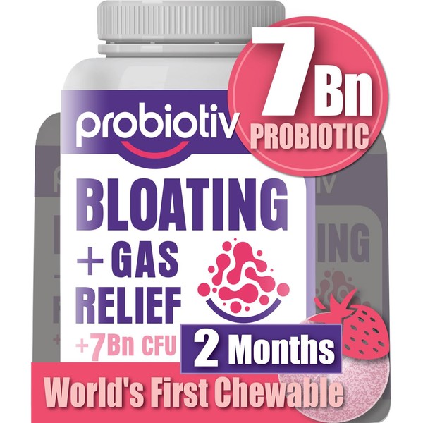 Probiotiv Gas & Bloating Relief for Women 7 Billion CFU – Chewable Probiotics & Daily Digestive Enzymes Debloating for Women, Aids Digestion & Promotes Digestive Health, 60 Strawberry Tablets