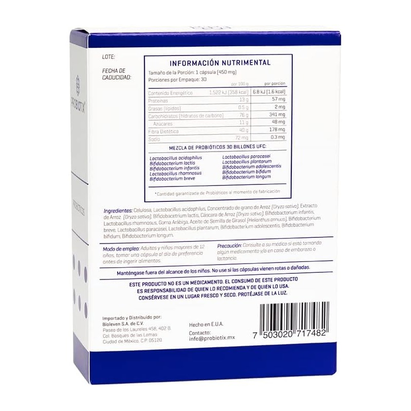 Descripción optimizada: ¡Mejora tu salud intestinal con Probiotix! Cada cápsula de 30 Billones de Probióticos con 10 cepas diferentes y Inulina de agave está diseñada para equilibrar tu flora intestinal y promover una digestión saludable. Ideal para hombres, mujeres y niños, este suplemento no requiere refrigeración, lo que lo convierte en un aliado fácil de incorporar a tu rutina diaria.