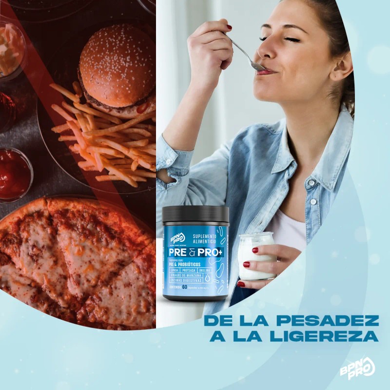 Probióticos + Prebióticos | Inulina, Enzimas Digestivas, Papaya, Bromelina, Lipasa, Vinagre de Manzana | Apoya La Digestión, Absorción de Nutrientes Y Bienestar General | Pre&Pro BPN PRO 60 Cápsulas ¿Tienes digestión lenta, hinchazón o malestar después de comer. Probióticos + Prebióticos BPN PRO está formulado para equilibrar tu flora intestinal, mejorar la digestión y optimizar la absorción de nutrientes esenciales. Su fórmula combina 40 billones de probióticos multicepa con prebióticos naturales, enzimas digestivas y superingredientes funcionales como inulina, vinagre de sidra de manzana, papaya y lipasa, para ayudarte a sentirte más ligero, con menos inflamación y con mayor bienestar digestivo día tras día. Beneficios principales: - Equilibra la microbiota intestinal y promueve una mejor salud digestiva. - Reduce hinchazón, gases y malestar estomacal después de las comidas. - Mejora la absorción de nutrientes clave como hierro, calcio y vitaminas. - Apoya al sistema inmune desde el intestino, tu segundo cerebro.