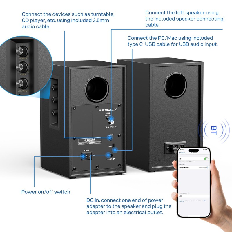 Probox BT16 Active Bookshelf Speakers 3.5" Woofer with 1" Tweeter, 60W RMS-Bluetooth 5.3, Built-in 24bit DAC Dynamic 3D 2.0 Surround Sound, Computer Gaming PC Speakers - Black