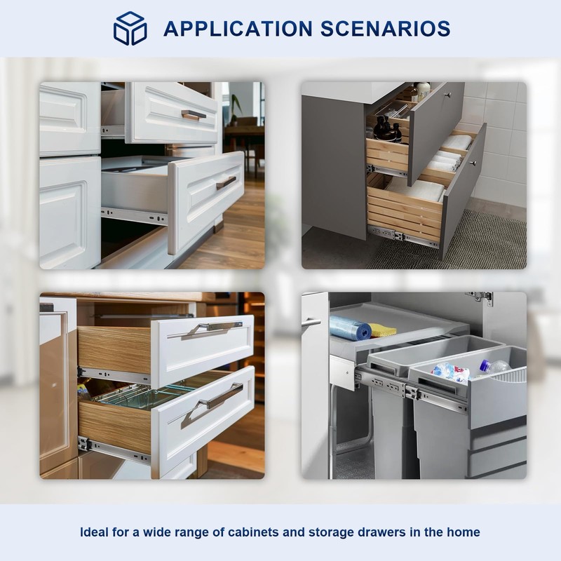 - Silent & Smooth: The soft close drawer slides are equipped with hydraulic dampers, offer a gentle closing effect, can effectively prevent children from injury. Double row solid steel ball bearing make the glides open and close silentlly and smoothly