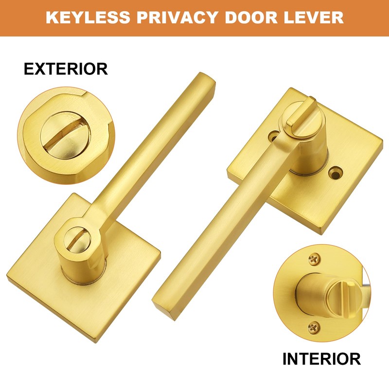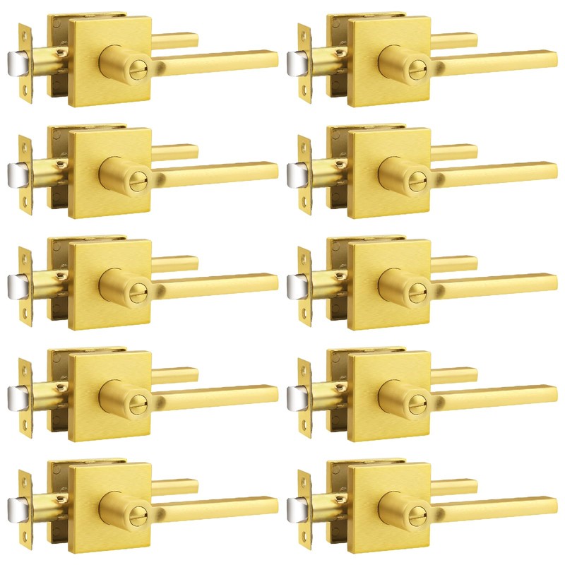 Probrico Gold Privacy Door Handle Lockset Heavy Duty Square Satin Brass Interior Door Lever for Bedroom or Bathroom Reversible Keyless Handleset Door Knob Slim Handed Levers, 10 Pack