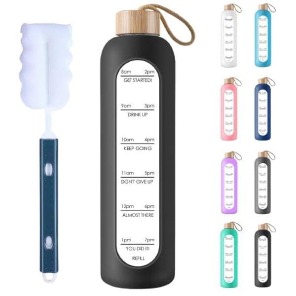 PROBTTL 32 Oz Borosilicate Glass Water Bottle with Time Marker Reminder Quotes, 1 Liter Leak Proof Reusable BPA Free Motivational Water Bottles with Silicone Sleeve and Bamboo Lid (Black)
