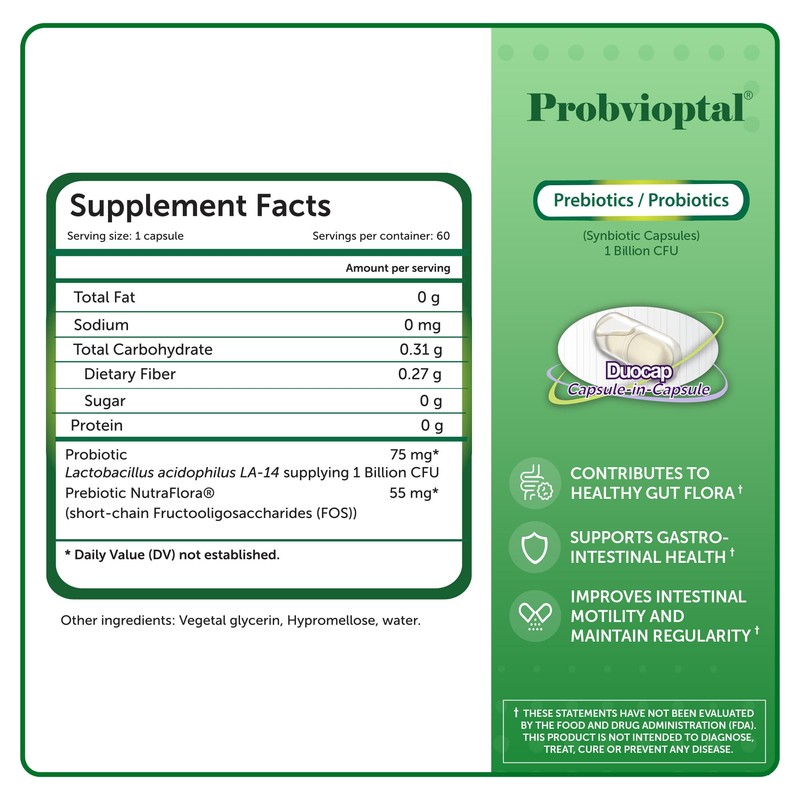 Probvioptal, 60 Capsules (1 Year Supply), Probiotics & Prebiotics, Duocap, 1 Billion CFU, Gluten Free