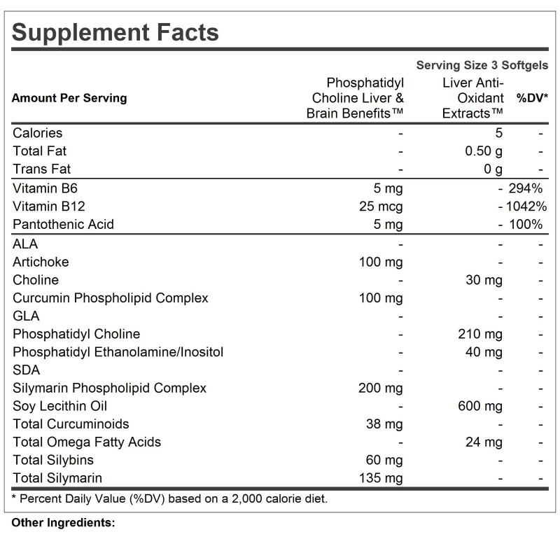 - Superior pure bio-active ingredients - Provides a concentrated, stable source of liquid phosphatidyl choline. Delivers a unique blend of plant extracts and nutrients, including Milk Thistle, Turmeric ad Artichoke extracts. Contains no Milk / Dairy-Free, Gluten-Free; no yeast, wheat, sodium, salt, sugar, cholesterol, color, preservative or manufacturing additives.