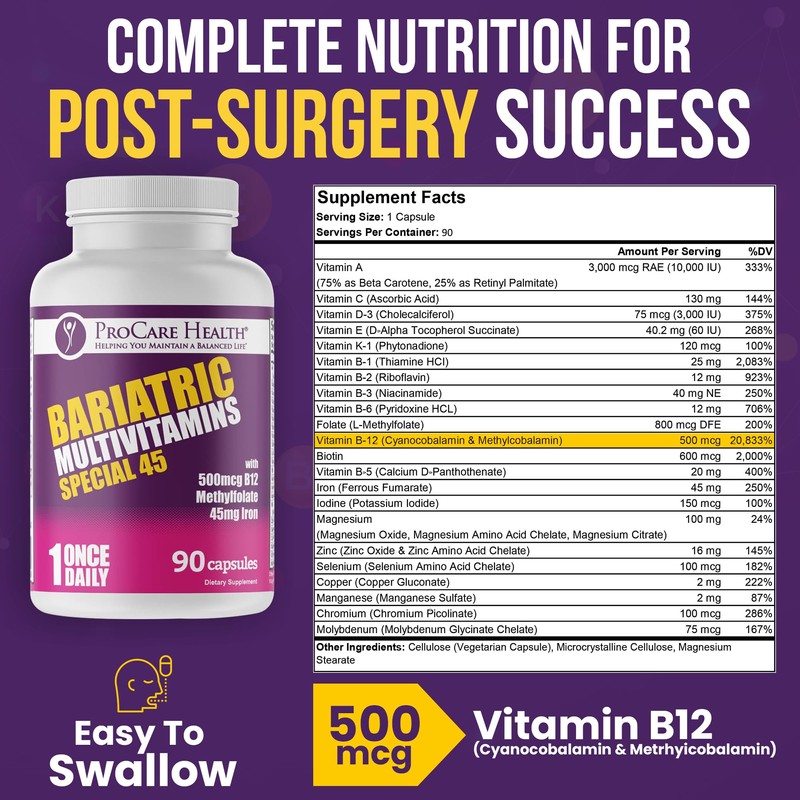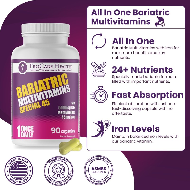 ProCare Health Bariatric Multivitamin Special 45 with 45mg Iron is specifically designed to support individuals after bariatric surgery, including gastric bypass, vertical sleeve, Roux-en-Y, and duodenal switch. After surgery, multi vitamin with iron for women maintaining proper nutrition is crucial for recovery and long-term health. Our once-a-day capsule provides 45mg of carbonyl iron along with essential vitamins and trace minerals, eliminating the need for multiple supplements. Developed in collaboration with bariatric doctors and dietitians, this multivitamin contains key nutrients such as Vitamin C, B6, D3, zinc, and 500mcg reduced B12. These ingredients work together to support immune health, energy levels, with nutrients it needs for optimal post-op recovery with 90 Fast-dissolving veggie capsules providing a full 1-month supply. The 45mg of iron gastric bypass vitamins helps maintain healthy iron levels, a common concern for post-surgery patients. Carbonyl iron is gentle on the stomach, minimizing the risk of discomfort by other forms of iron supplements. Our bariatric multivitamin is free from flavorings, sweeteners, gluten, dairy, and GMOs, making it ideal for sensitive post-op stomachs. The bariatric vitamins for gastric bypass fast-dissolving vegetable-based capsules are easy to digest and bariatric hair skin and nails vitamins dissolve quickly, instant-release vitamins with iron capsules can cause. ProCare Health's vitaminas bariatricas multivitamin also provides exceptional value, saving you over 45% compared to leading brands while still meeting ASMBS guidelines. Each batch is manufactured in the USA and is third-party tested for potency, purity, and safety. With our once-daily formula, you get the essential nutritional support needed after bariatric surgery to help maintain your energy, support your immune system, and keep your body thrivingall in one convenient, easy-to-digest capsule. Trust ProCare Health to support your post-surgery health journey.