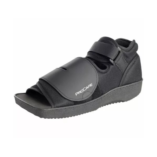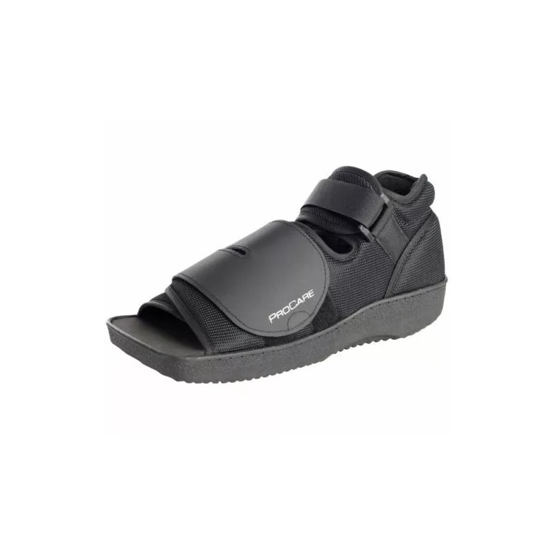 The ProCare Squared Toe Post-Op Shoe allows the dressing to be kept clean and toes dry, providing stable protection following post-operative procedures and forefoot trauma. The square toe design acts as a bumper and provides additional room and comfort for your foot. The shoe also features high ankle strapping that maintains your foot in proper position. A rigid rocker sole allows for ease of ambulation and pressure reduction. Universal fit allows the ProCare Squared Toe Post-Op Shoe to be worn on either the left or right foot.