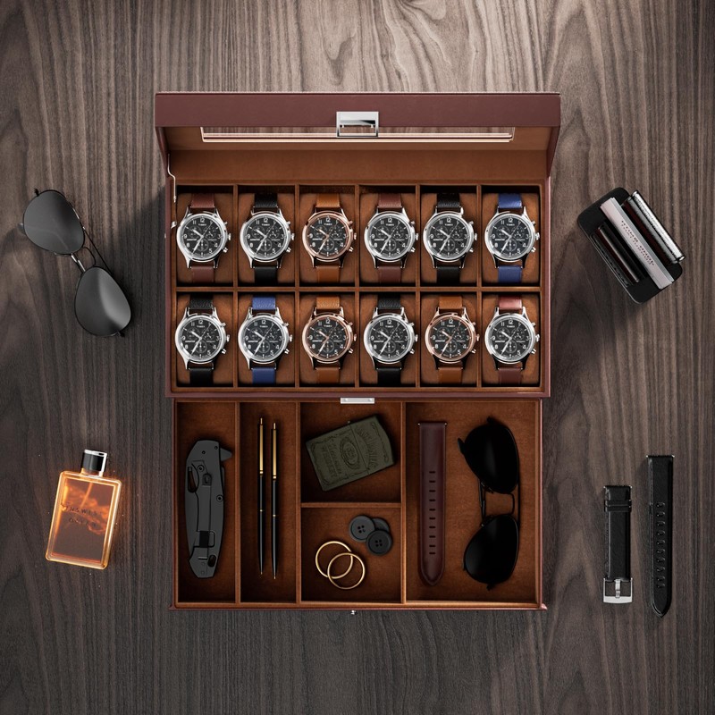 - [2-Layer] The upper layer can hold 12 watches, and the bottom drawer offers additional storage for watchbands, cufflinks, bracelets, rings, pens, necklaces, and other jewelry, keep them in one place and protect them against dampness, shaking and friction, or missing