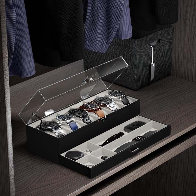 - 2-Layer & Organize in one place: The upper layer can hold 6 watches, and the bottom drawer offers additional storage for sunglasses, watchbands, cufflinks, bracelets, rings, pens, necklaces, and other jewelry.
