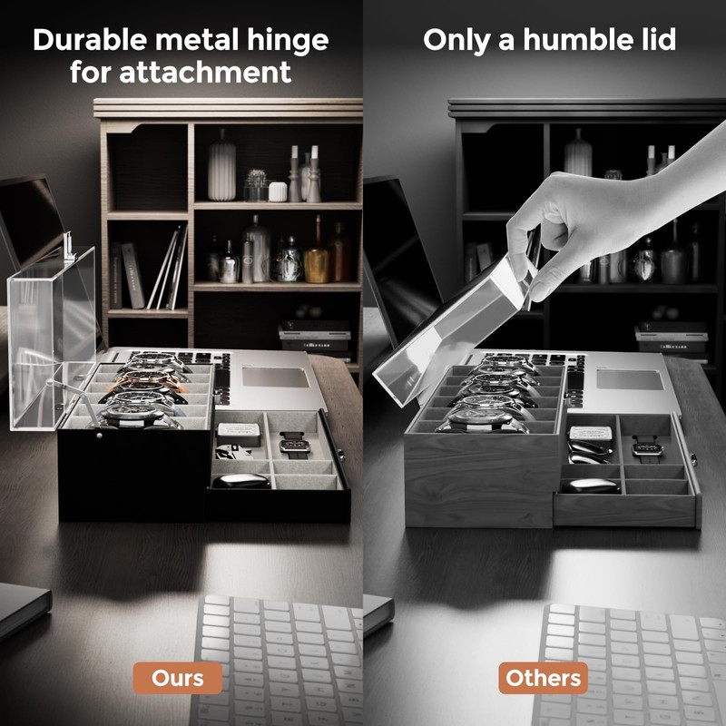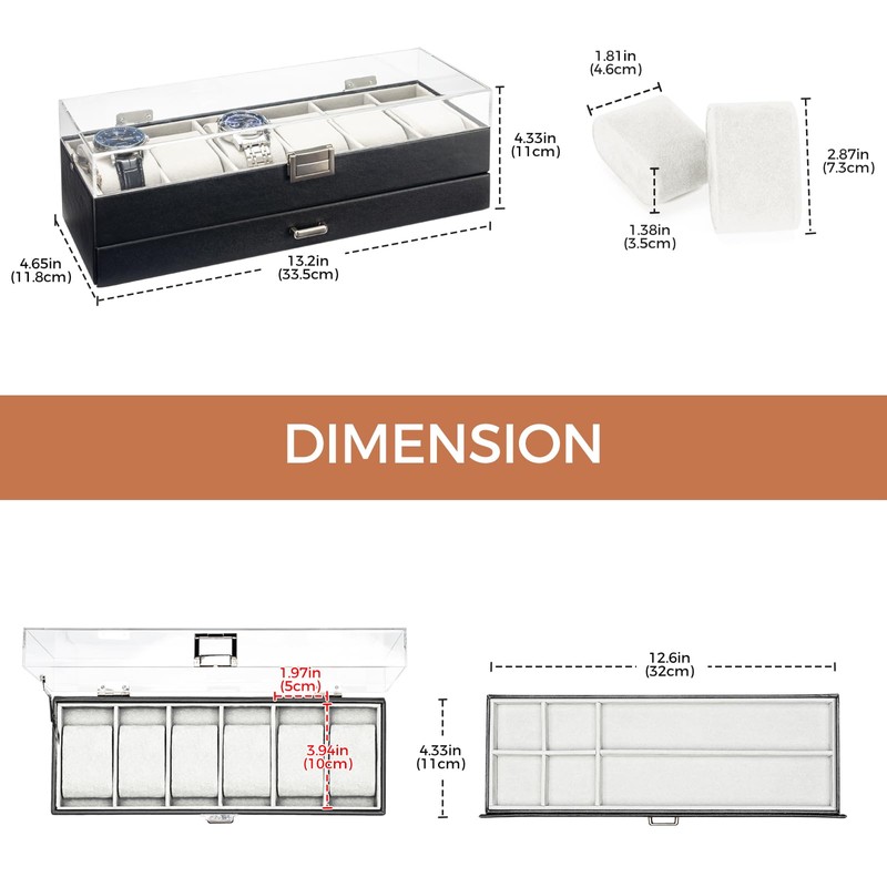 - Quality Materials: The sturdy thick acrylic lid with hinges ensures that won't fall off the box; The waterproof PU leather exterior and soft lining for a stylish look to protect the watch from scratches; soft-yet-supportive pillows fit most sizes and styles of watches, keeping them in good shape.