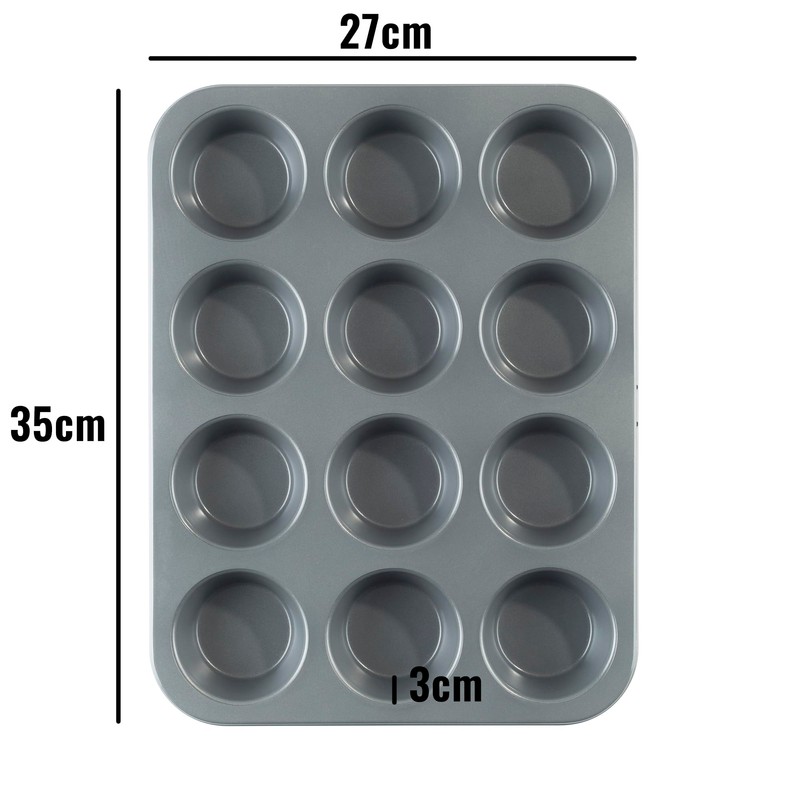 Prochef Prochef KB1003 Teflon Non-Stick Premium Coated 12 Cup Tray/Tin-Length 35cm x Width 27cm Carbon Steel for Muffins or Cupcakes-Silver, Black, 35 x 27 x 3cm