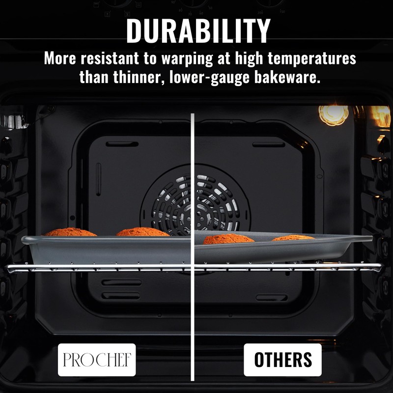 - ENHANCED DURABILITY C Designed to resist warping under high temperatures, this bakeware is built to endure the thermal stress of frequent high-heat use. It retains its shape without bending or deforming, unlike thinner, lower-gauge bakeware