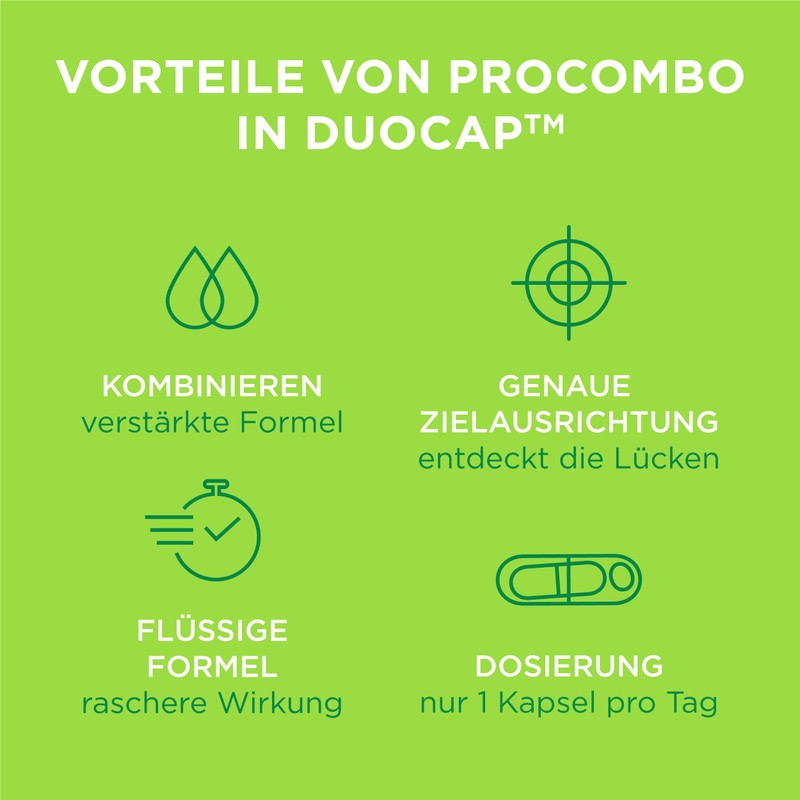 - Everything is delivered to the right place, because the double capsule DuocapTM releases the ingredients in two phases. So gelangen die "guten" Bakterien in ProCombo unbeschadet in den Darm und siedeln sich dort an.
