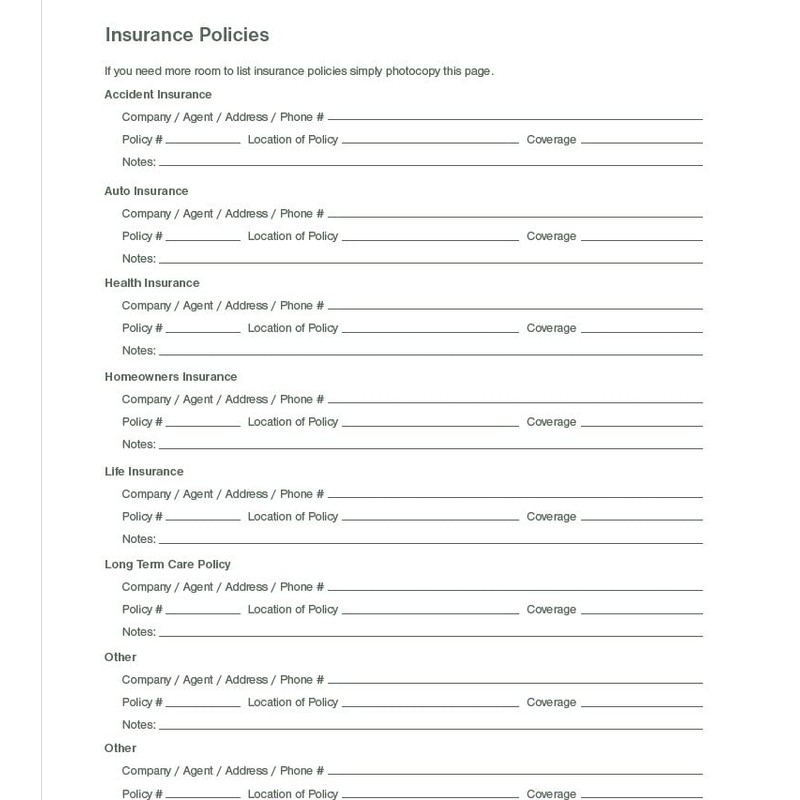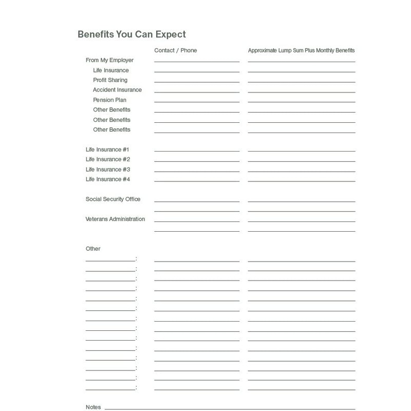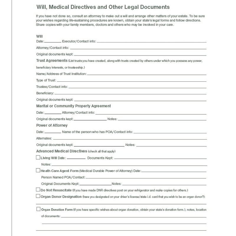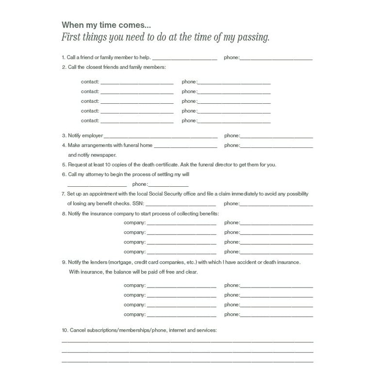- This organizer contains sections for the following information: Personal Message to Loved Ones, Location of Personal Papers, Websites/Online Records, Important Contacts, Insurance Policies, Family Health History, Information on Medical Directives and Other Legal Documents, Wishes about Personal Property, Overview of Assets, Overview of Debts, Banking Information, Investment and Real Estate, Vehicles, Benefits You Can Expect, Burial/Cremation Choices, and Things to Do At The Time Of My Passing