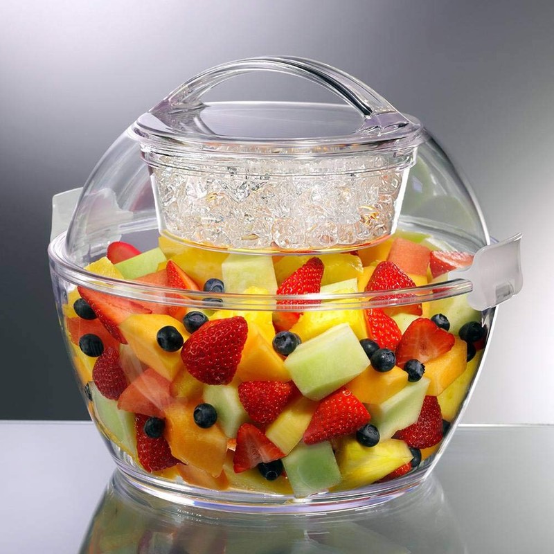Carry & serve bowl with ice chamber above. Cold air descends keeping salads and such chilled and fresh for hours on the go or on the table. Large Capacity 5. 5 quart bowl. Clip-on dome lid with built-in ice chamber and carry handle. Screw-on lid for ice chamber with leak proof silicone seal. For “to go” mode, simply flip the clips up to lock Dome lid to bowl. No need to clip during “to serve” mode. Dome lid keeps the cold in and the bugs out. Ice may be replaced at any time without disturbing the salad. Bowl overall measures 10 ¾” D x 10” H.