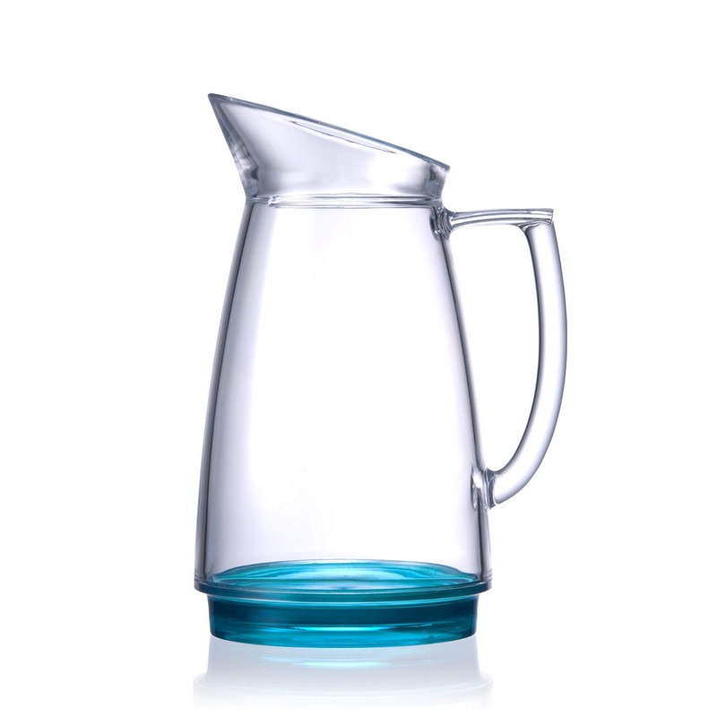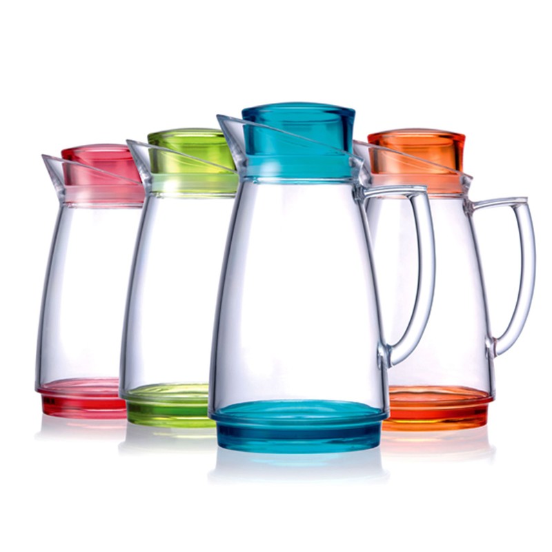 Beautiful new collection of thick wall acrylic pitchers, carafes, tumblers and more. High style design features clear bodies with colorful lids and bases in red, green, clear, blue or orange. BPA free.