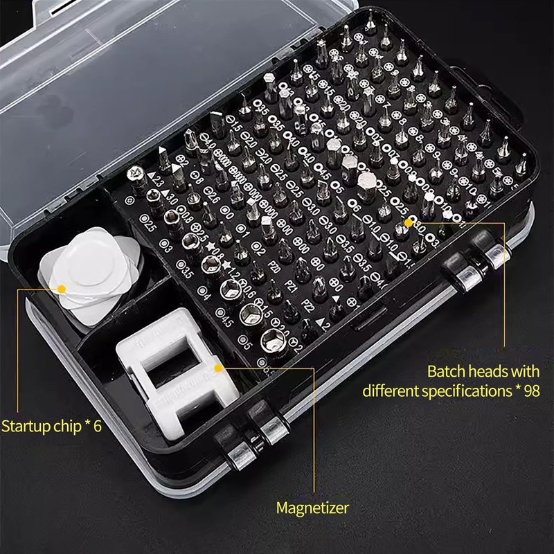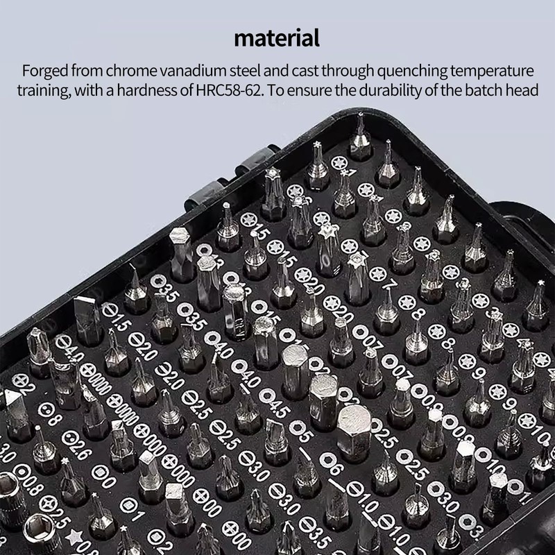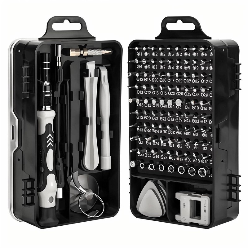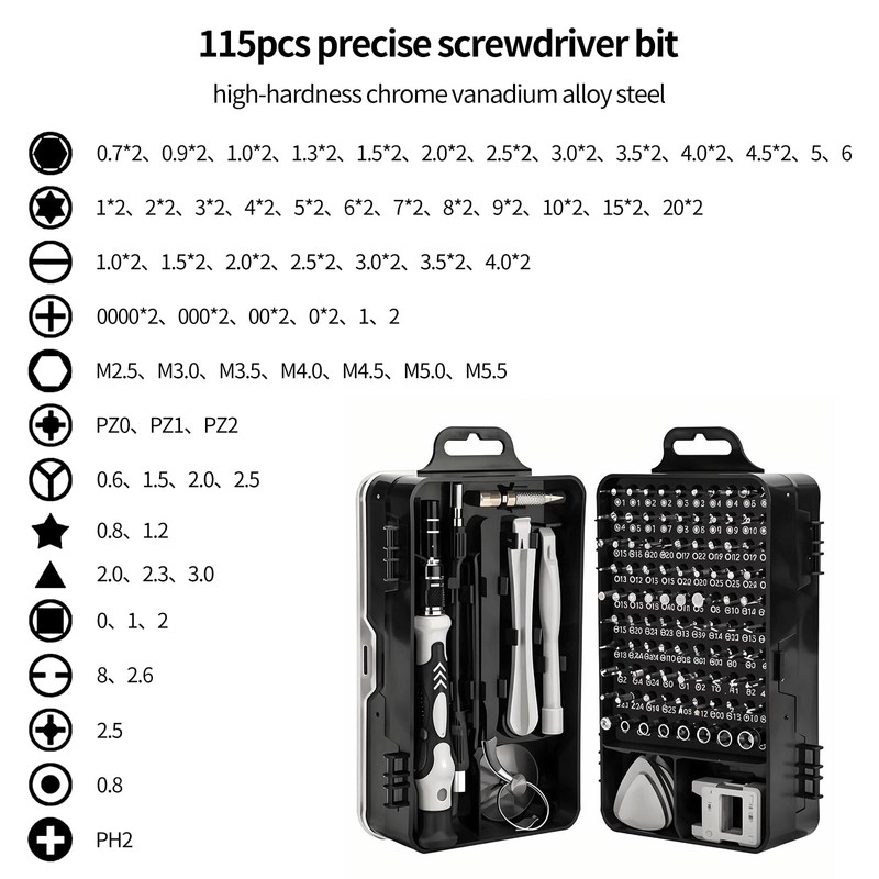 - 115 Versatile Tools in One Kit – Includes 98 hardened steel bits + 17 accessories (magnetic holder, tweezers, suction cup, SIM tool). Perfect for repairing phones, laptops, drones, watches, consoles, and delicate electronics