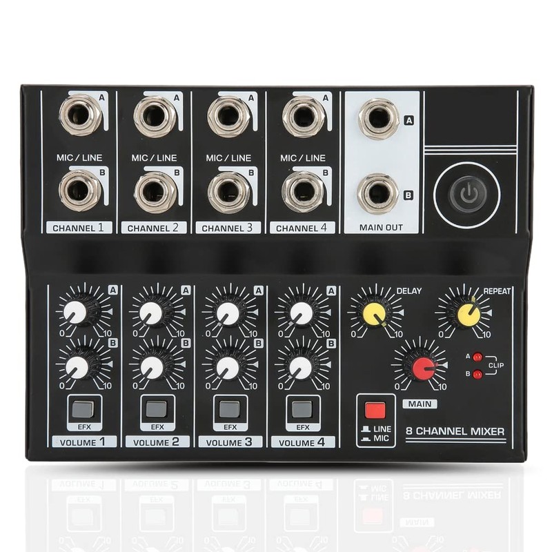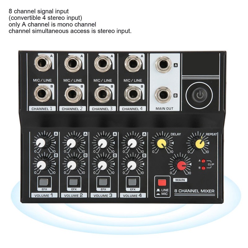 • 8 CHANNEL INPUT: The mini audio mixer supports 8 channel signal input (4 stereo convertible inputs), only one channel is mono and the input of the channel is stereo at the same time. Each stereo channel has an independent reverb effect selection switch (usually microphone is on, instrument is off).