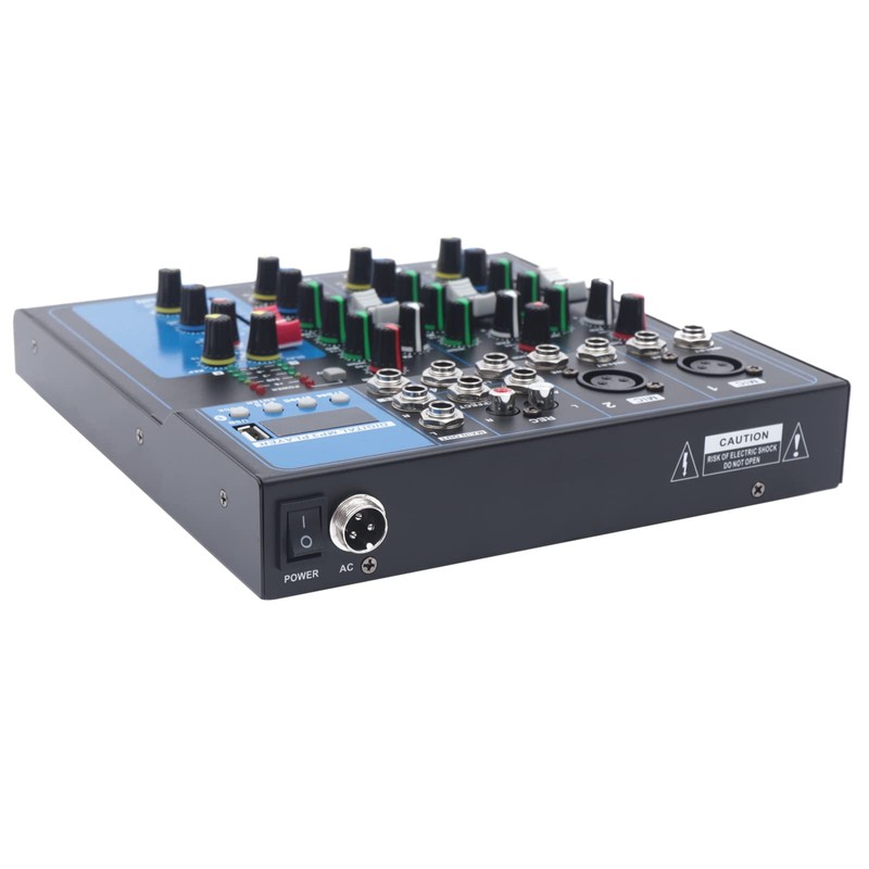 The impact-re-sistant powder-coated metal housing makes this 4-channel mixer more durable and have a long service life. Its U-disk playback function, wire-less-Blue-tooth function,and excellent reverberation effect will give you a better music experience.It can access guitar, electric piano, microphone, audio amplifier, DVD. It is suitable for professional bar DJs, big stage performances, wedding banquets, host speeches, campus DJ broadcasts, family entertainment, etc.