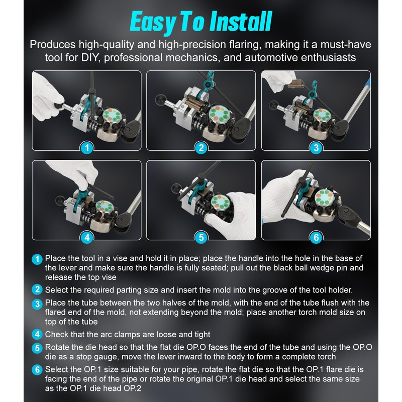 - Tips for Use: Before flaring the brake pipe flaring tool kit set, wear work gloves, remove burrs inside and outside the pipe to ensure that there are no metal chips and impurities inside and outside the pipe; keep the spring and screw lubricated before locking, which will help the use of this tool; be patient and check frequently that the work is done correctly; if you operate the tool inside the car, try to find a comfortable position to make full use of the light; be sure to clean up thoroughly after operation