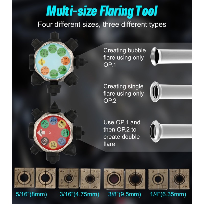 - Multi-size Flaring: Our professional brake line flaring tool kit for 45 and 37 degree can be used for 3/16“, 1/4”, 5/16“, 3/8”, four different sizes and three different types, a must-have tool for DIY, professional mechanics and car enthusiasts