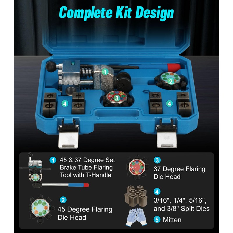 - Package Includes: Brake flaring tool kit includes a 45 and 37 degree professional brake flaring tool (for bench vise), 1 handle, 8 split grinders 3/16“, 1/4”, 5/16”, 3/8“ (45 and 37 degrees, 4 each), 1 pair of gloves, comes with tool box, blow molded case holds everything