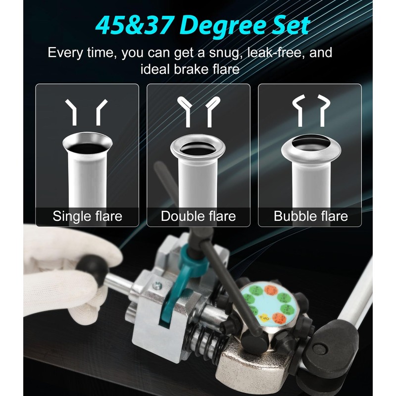 The 45 and 37 degree flare professional brake line flaring tool kit is rugged and well-designed to withstand daily use without slipping or bending under pressure. brake line flaring device offers a wide range of adapters, making it versatile for brake line work on a variety of vehicles. Options. For those familiar with brake repair or line work, this tool is easy to use and efficient in getting the job done, making it a must-have for DIYers, professional mechanics, and automotive enthusiasts