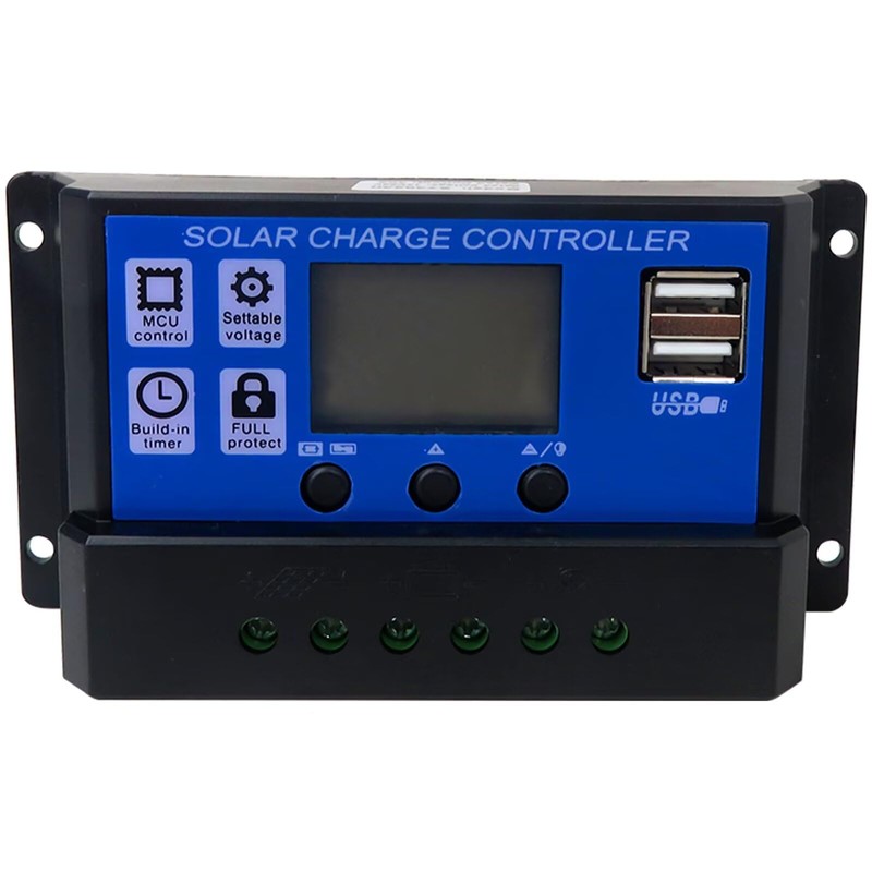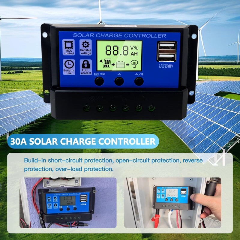 Professional Charge Controller Replacement for 30A Solar Panel Battery, 12V/24V with Adjustable LCD Display Auto Dual USB Blue
